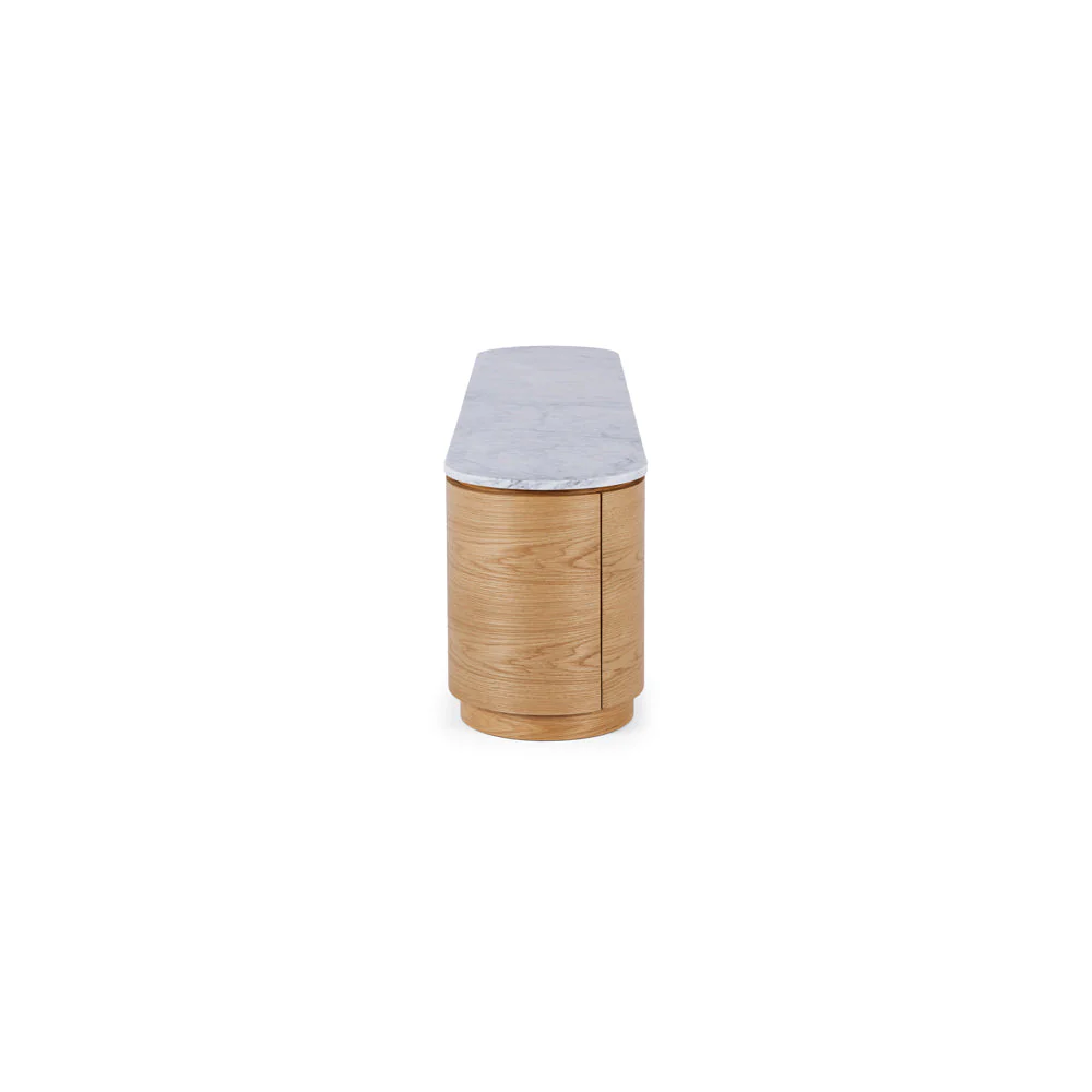 The Akita TV Stand is crafted from oak with beautifully curved edges and finished with a premium Carrara marble top – a timeless combination of warm wood and cool stone that elevates any living room.Two side opening doors and 2 deep drawers hide all your media clutter, keeping things sleek, tidy, and minimalist. Whether you’re styling a modern lounge, a contemporary apartment, or a designer home, this oak and marble entertainment unit delivers form, function, and serious good looks.