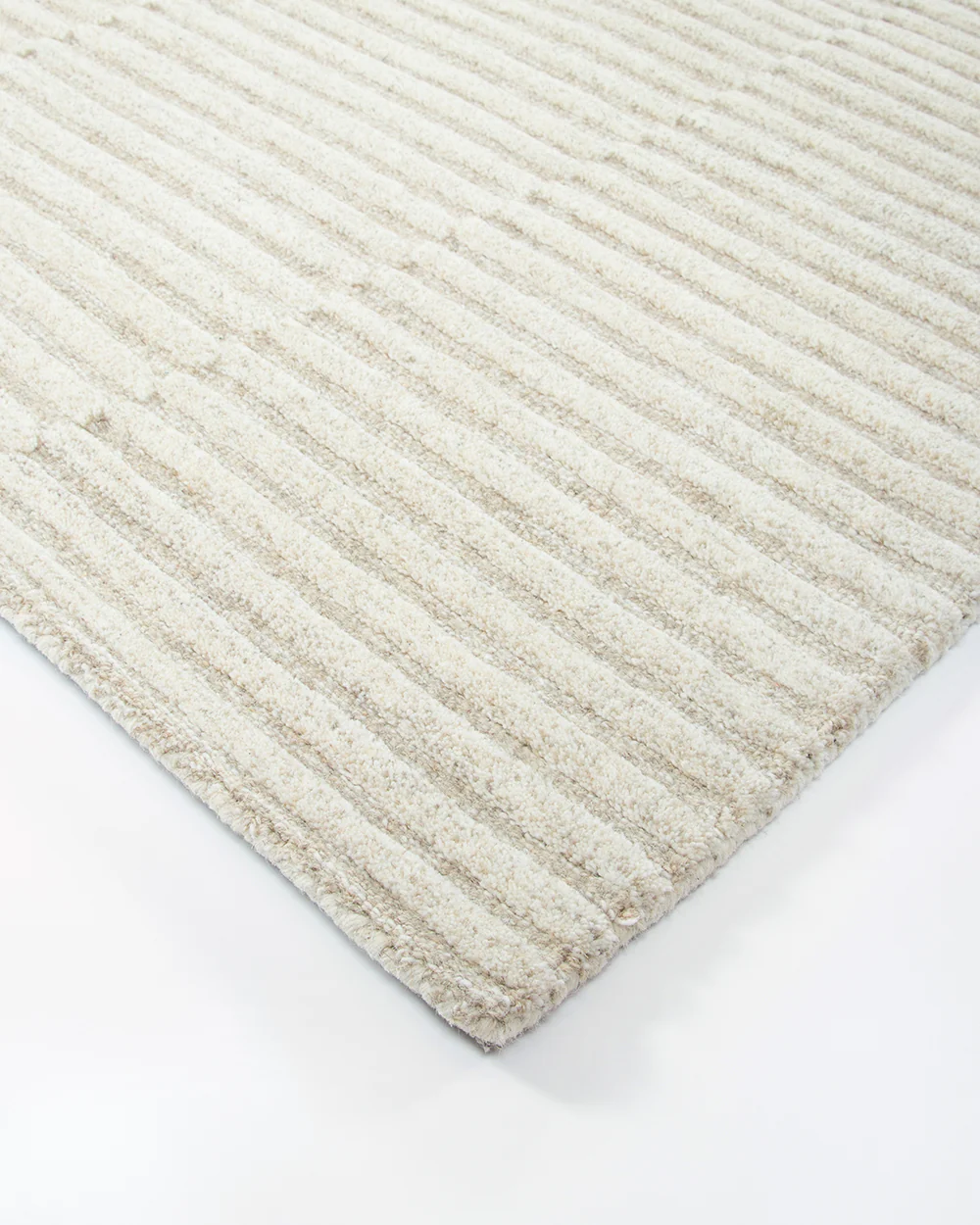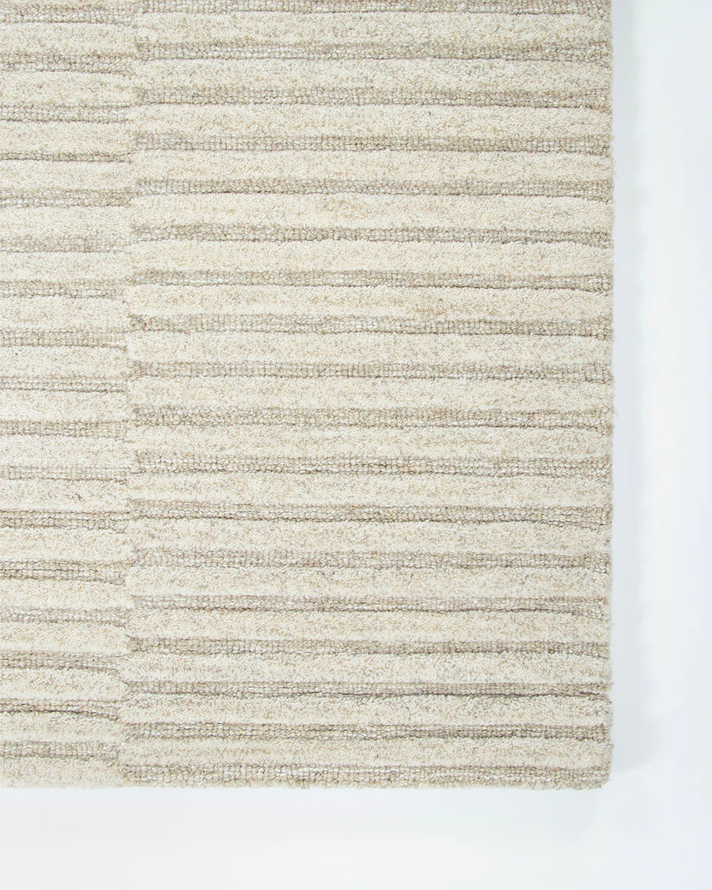 A visual and textural masterpiece, the Anni rug combines statement design with casual simplicity. Handcrafted from 100% wool, the offset linear pattern is achieved through sections of cut and looped pile, resulting in a captivating textural aesthetic. The natural sand tone effortlessly adds warmth and depth for contemporary living.