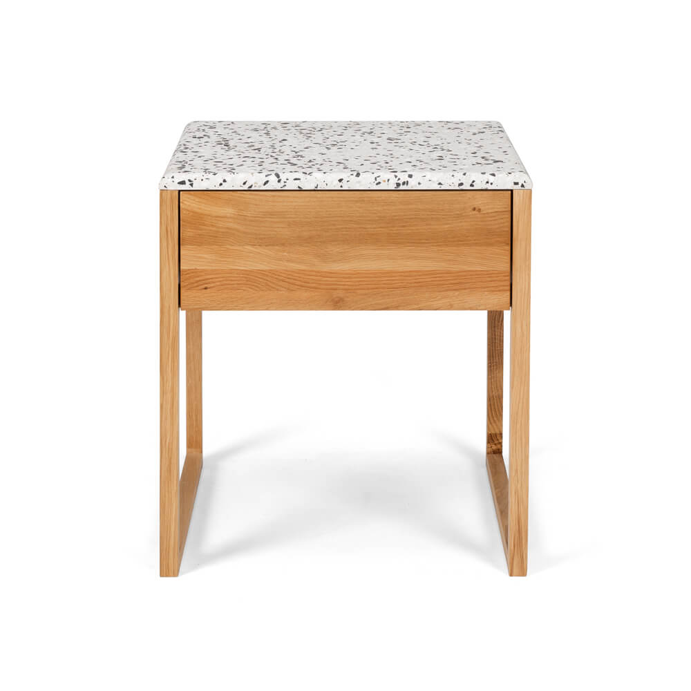The Avalon Side Table offers both beauty and function with its deep drawer storage and handy shelf, leaving the top clear of clutter. Crafted from oak and thick oak veneer the Avalon features a Terrazzo top with an elegantly chamfered edge.
