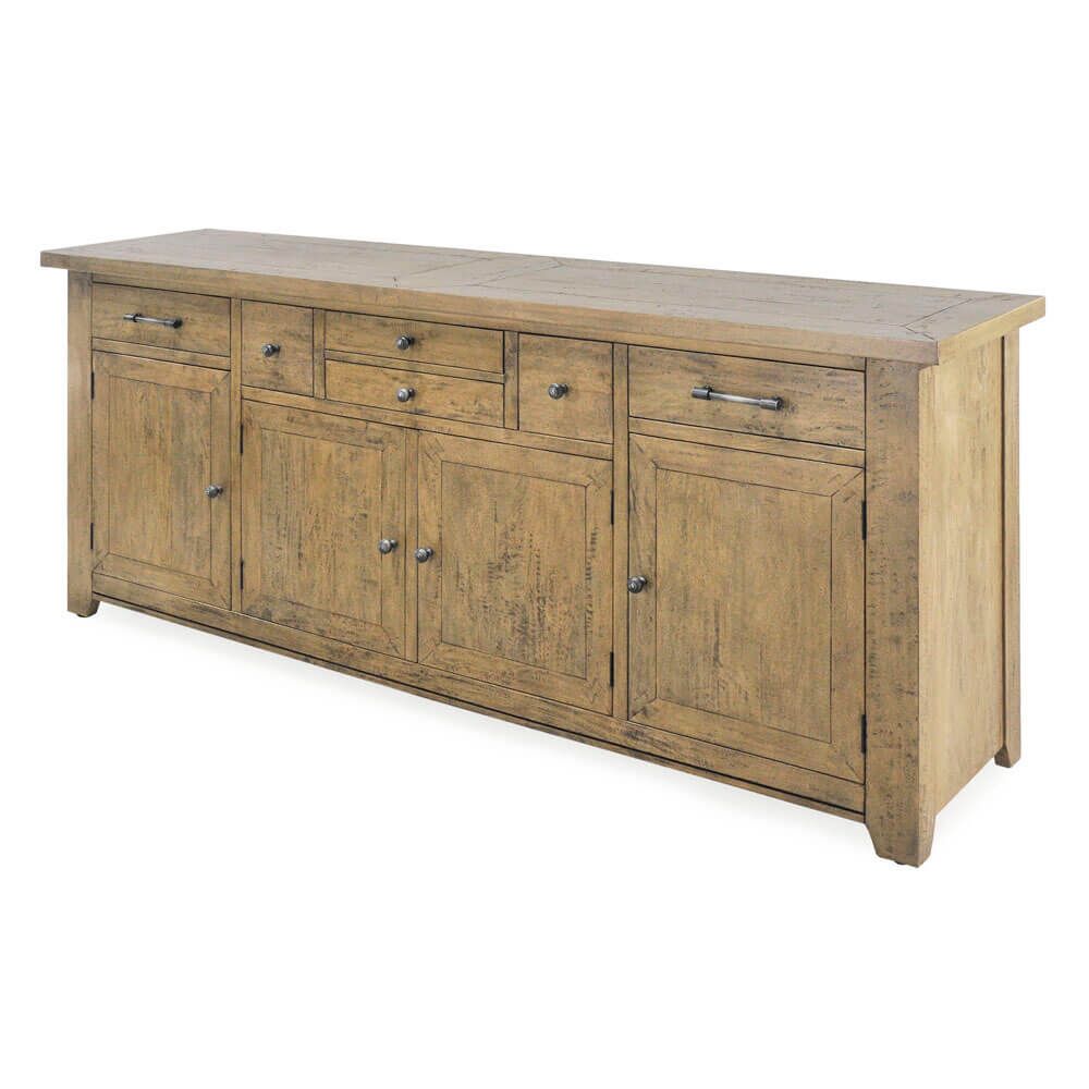 THIS BEAUTIFUL BOSQUET 4 DOOR & 6 DRAWER BUFFET IS A GREAT OPTION TO ADD CHARACTER AND TEXTURE INTO YOUR HOME. COMING WITH A RUSTIC LIGHT FINISH, THIS CABINET SHOWS OFF THE WONDERFUL GRAIN AND WARMNESS OF THE WOOD, COMPLIMENTED BY METAL HANDLES.