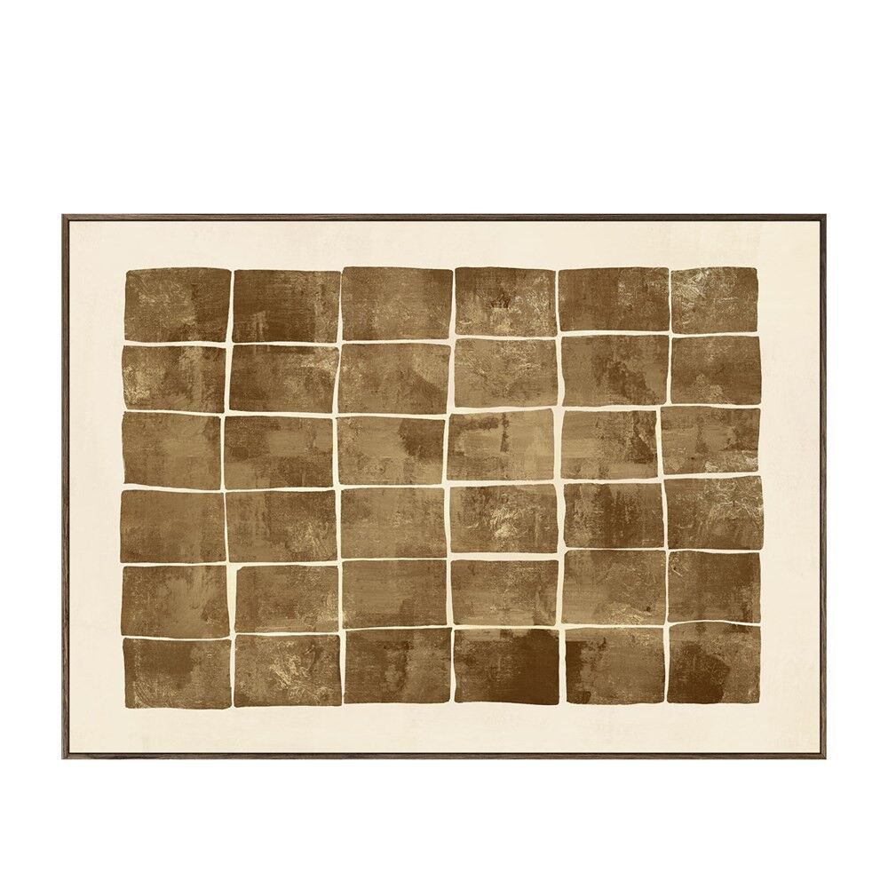 An abstract grid-like print in earthy brown tones on a light background—simple, warm, and organic.