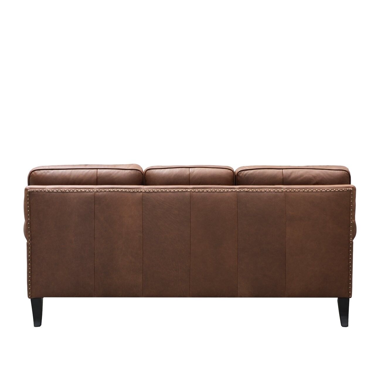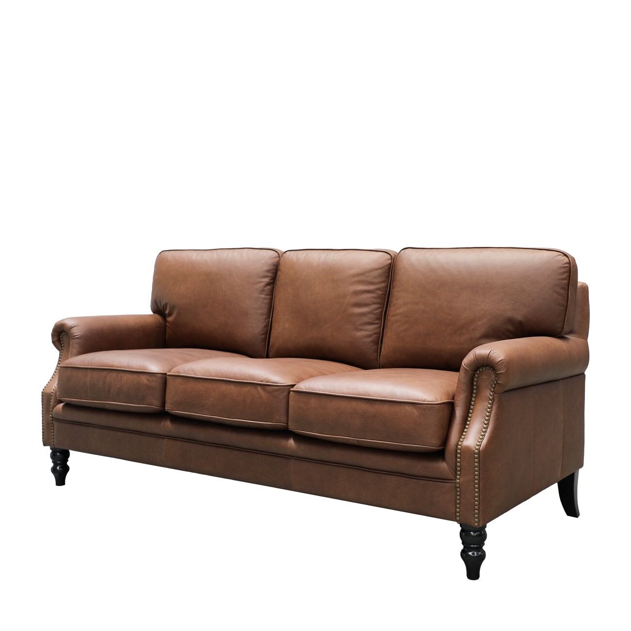 Pleated roll arms outlined with antique-bronze studs and scooped arms define its signature profile.