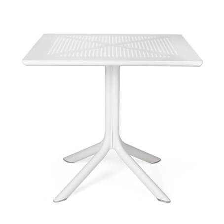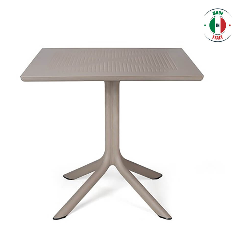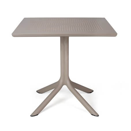 CLIP square table on a central pole and four feet. The table top is made of polypropylene DurelTOP, which is resistant to UV rays and other weather conditions. The legs are manufactured from anodized aluminium and covered in scratch resistant powder coat to perfectly match the colour of the table top and equipped with non slip feet. Adjustable leg height.