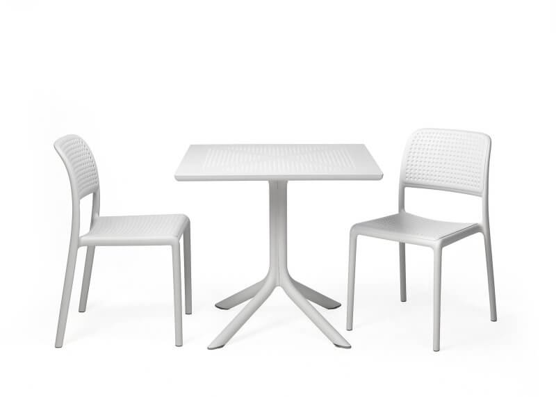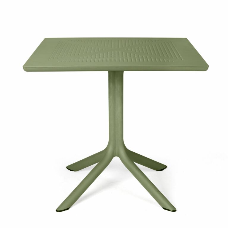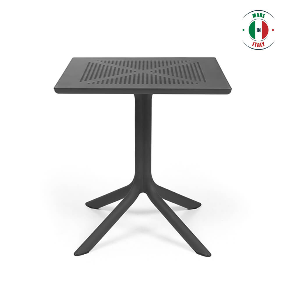 CLIP square table on a central pole and four feet. The table top is made of polypropylene DurelTOP, which is resistant to UV rays and other weather conditions. The legs are manufactured from anodized aluminium and covered in scratch resistant powder coat to perfectly match the colour of the table top and equipped with non slip feet. Adjustable leg height.