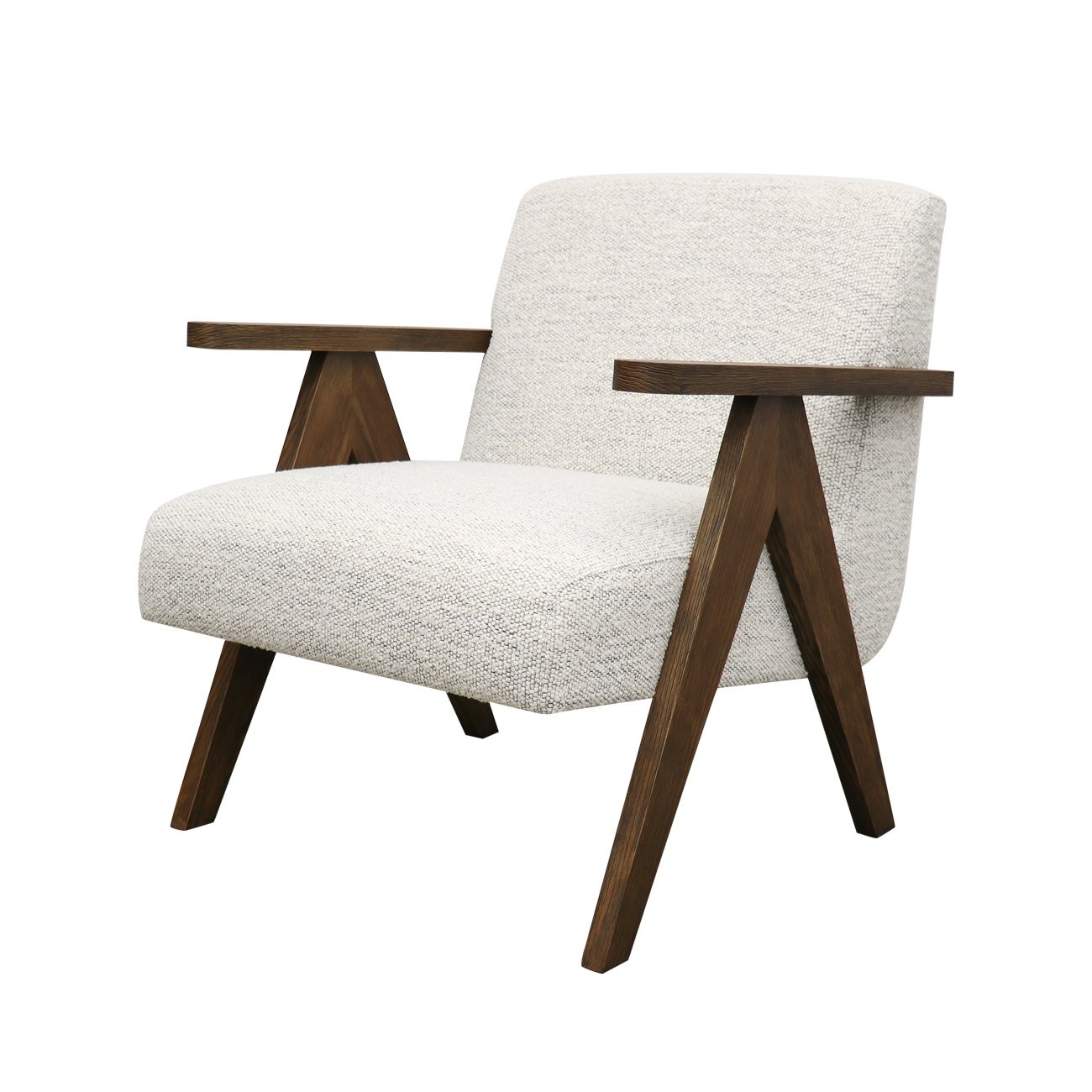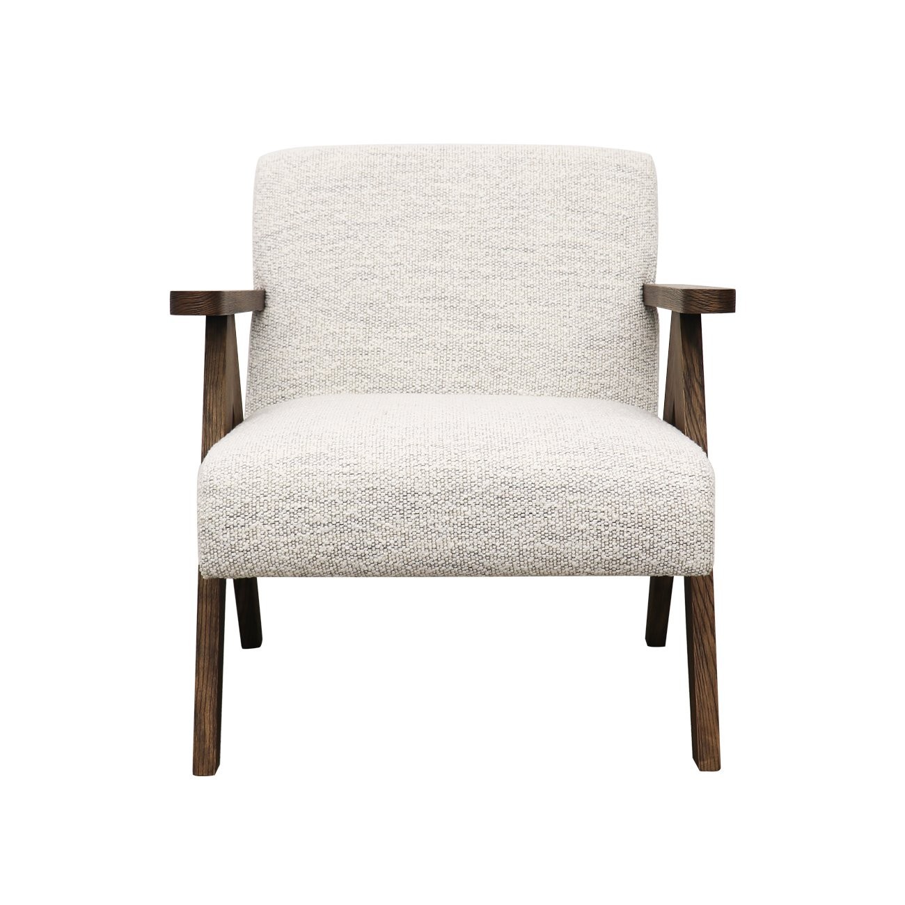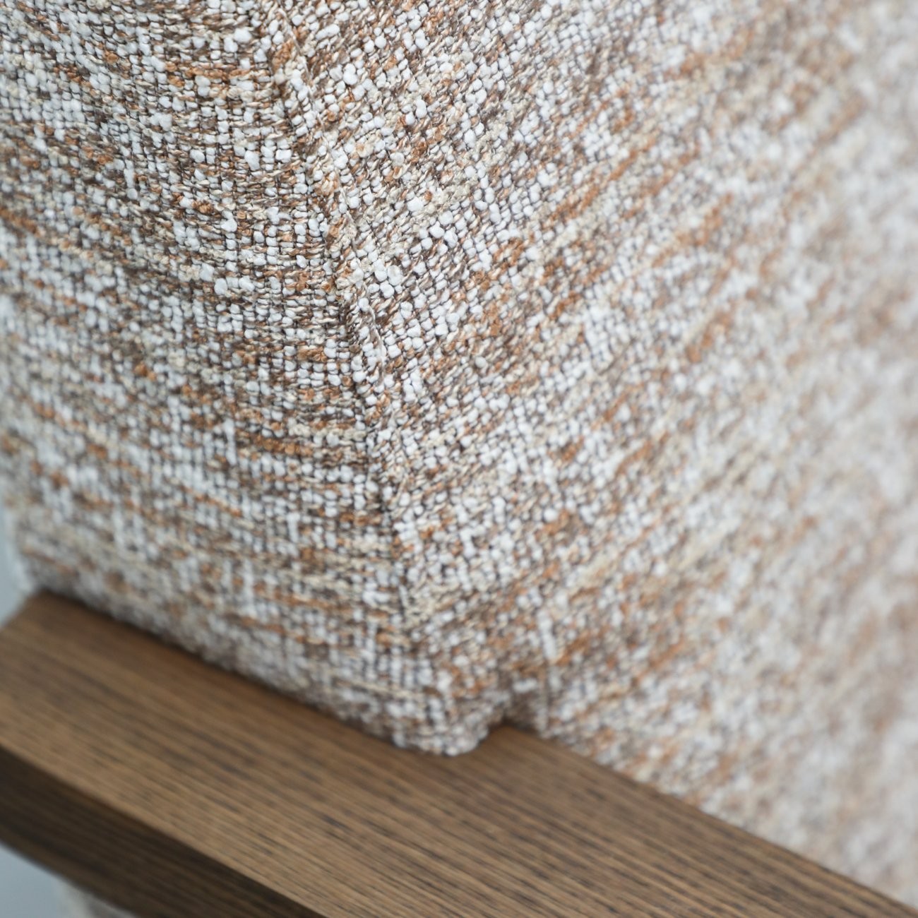 Warm timber colour framework is complemented by the stunning fabric of the Draper armchair. Cream and natural tones combine with contrasting threads, in soft to the touch fabric with texture and dimension.
