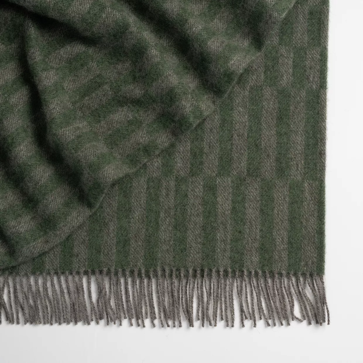 Glenorchy is a two-toned, plaid rectangle checkerboard design. Available in three earthy colourways – this Ivy Green throw features a bold green, offset with grey.