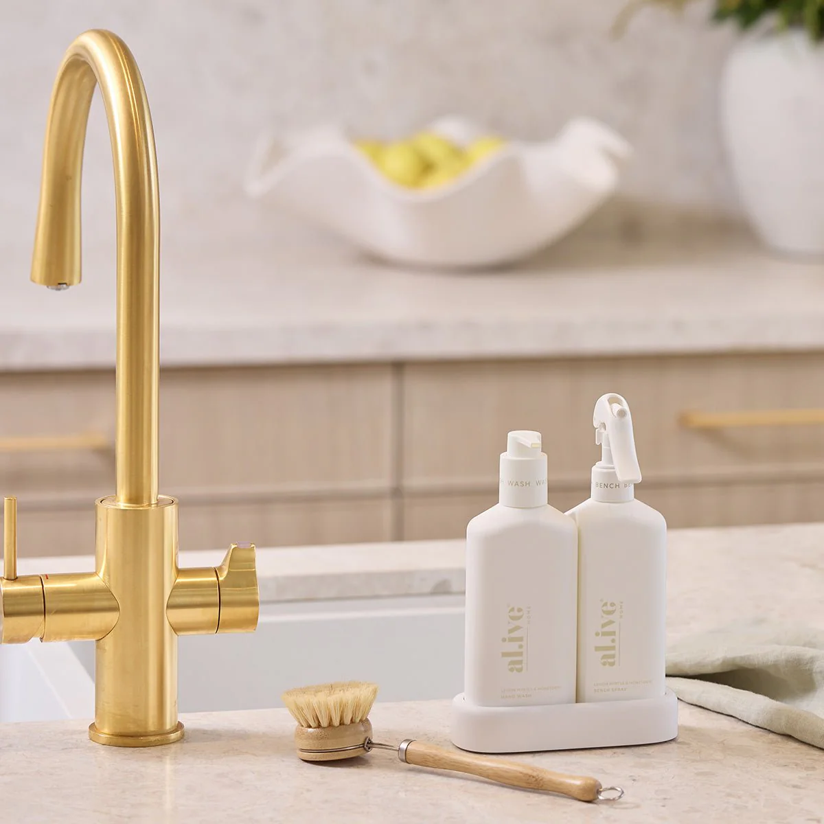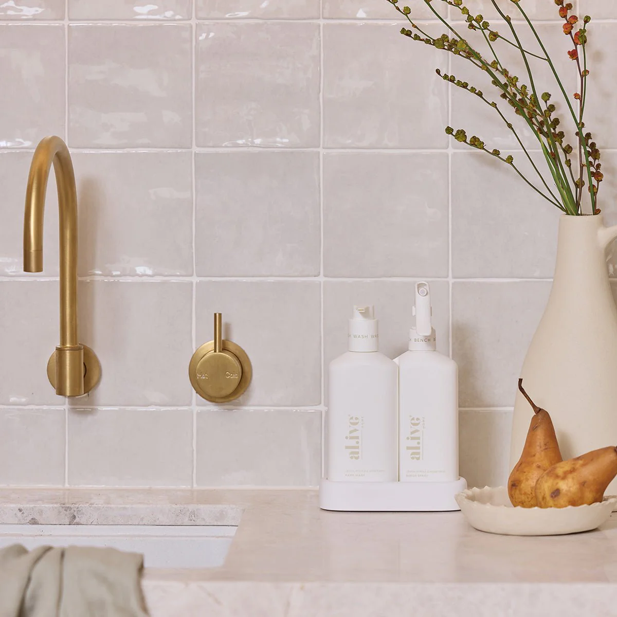 Enhance your kitchen routine with our Lemon Myrtle & Honeydew Kitchen Duo in Crisp White. This set includes our Bench Spray and Hand Wash, conveniently nestled within a beautifully designed custom tray to elevate your kitchen countertop.