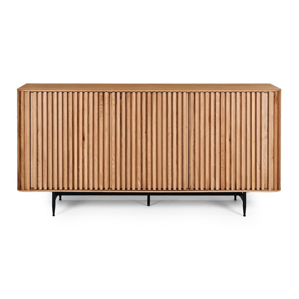 Construction Solid Oak with Oak veneers, unique strip panel design and soft closing doors.