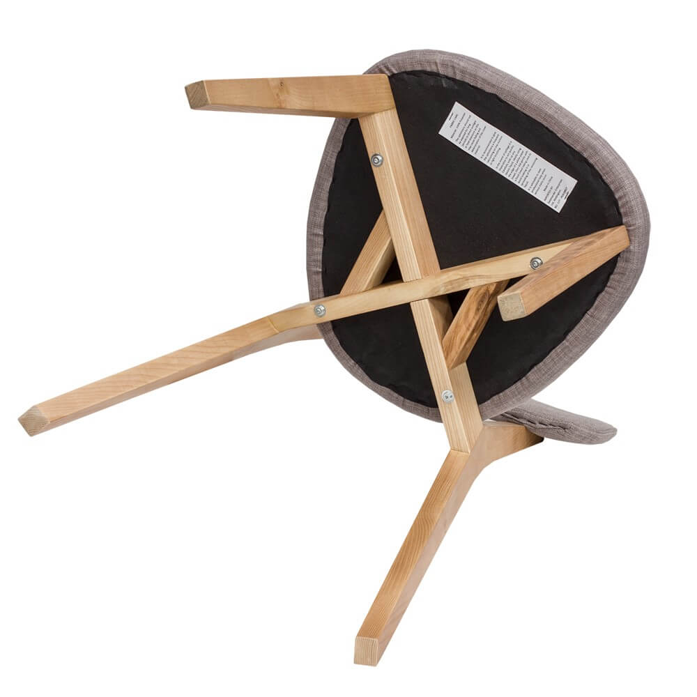 Design X-frame base, solid tapered Oak legs, plywood internals to prevent sag, durable polyester upholstery, padded seat and back with high density foam.