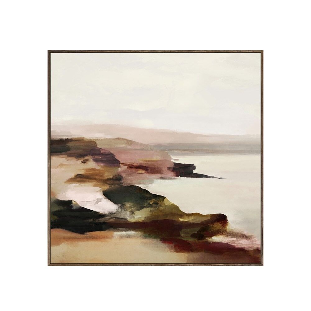 A hand embellished framed canvas featuring coastal cliffs in a minimalist, expressive style in gorgeous tones – a perfect finishing touch to any space.