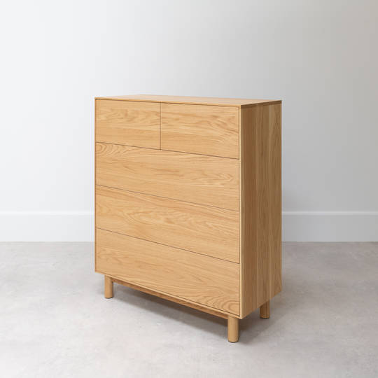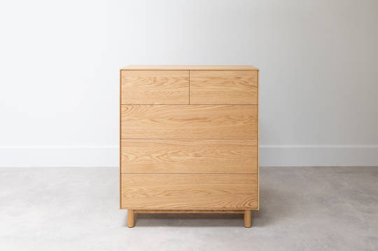 A fresh bedroom suite designed with New Zealand coastal environments in mind, fashioned from solid American White Oak with a timeless design. With smooth rounded legs and refined edging around the drawers.