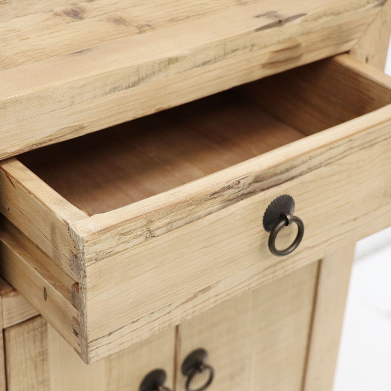 Hand-crafted in reclaimed Pine with a deliberate rustic and distressed finish, complete with notches, nicks and variation in wood grain.