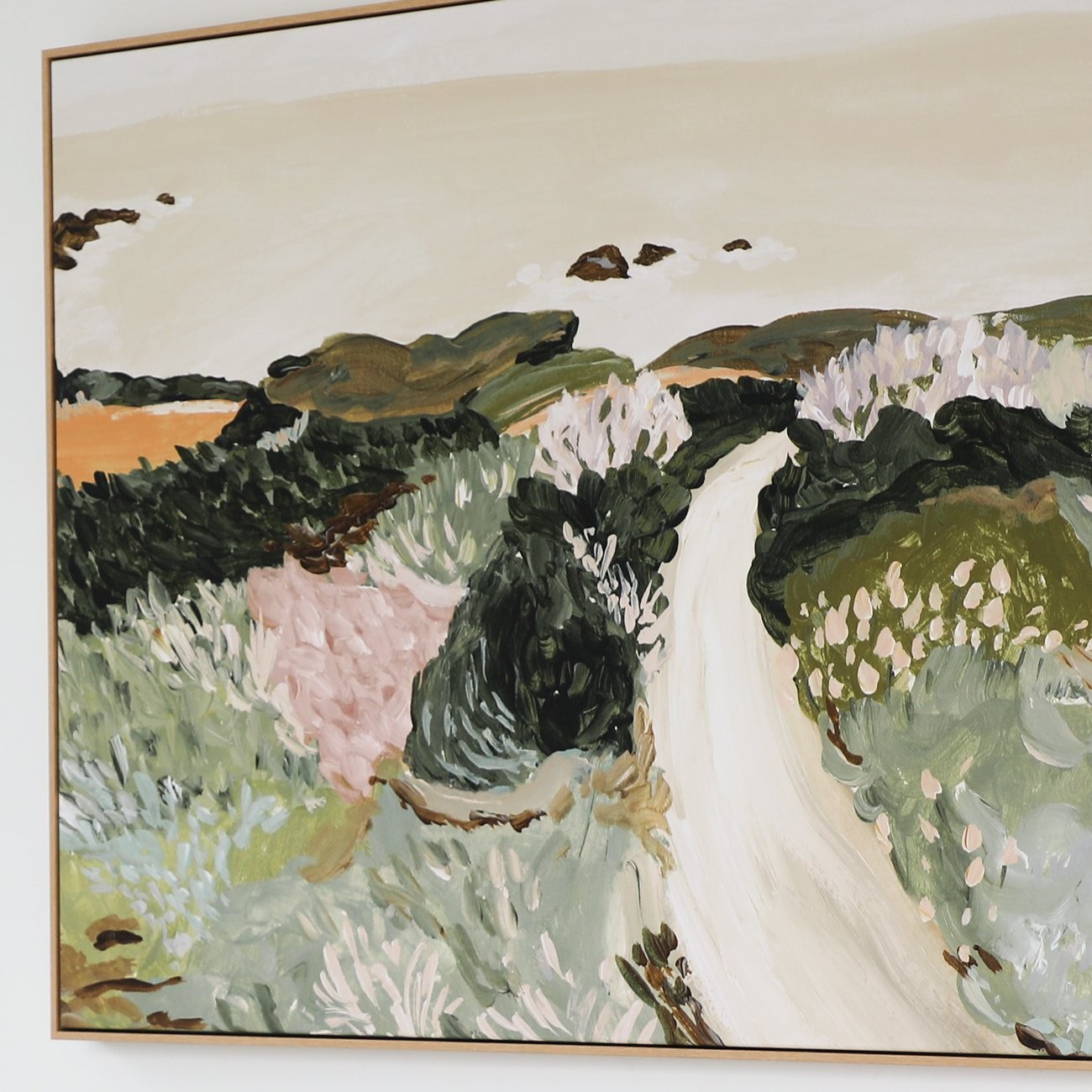 Add the perfect finishing touch to any space with this beautiful painterly design focusing on meadow in muted green and pink tones leading to the seaside.