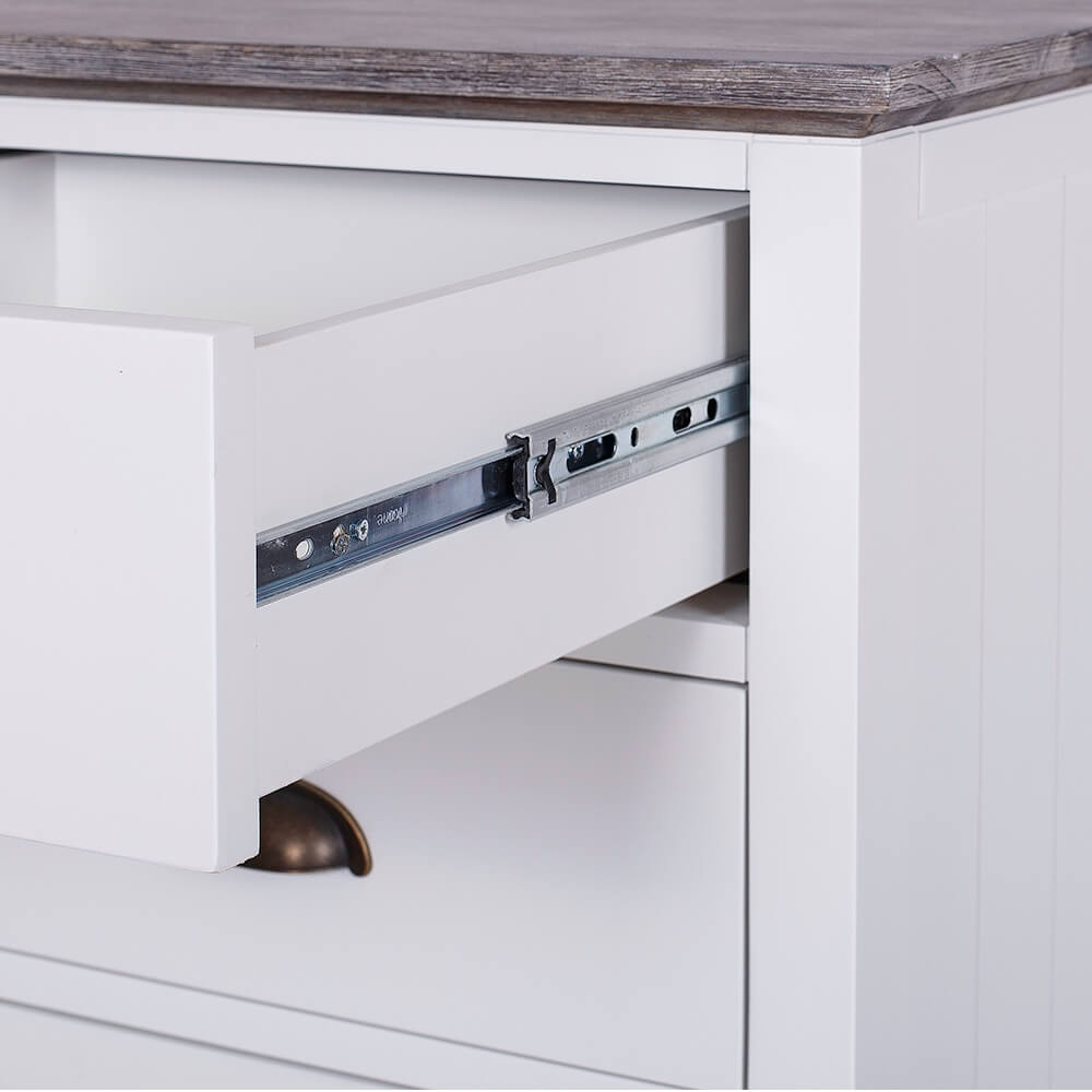 Construction Solid hardwood Acacia framing and MDF panels all coated in a durable satiny smooth white finish. Quality drawer runners and brushed traditional “cup style” handles.
