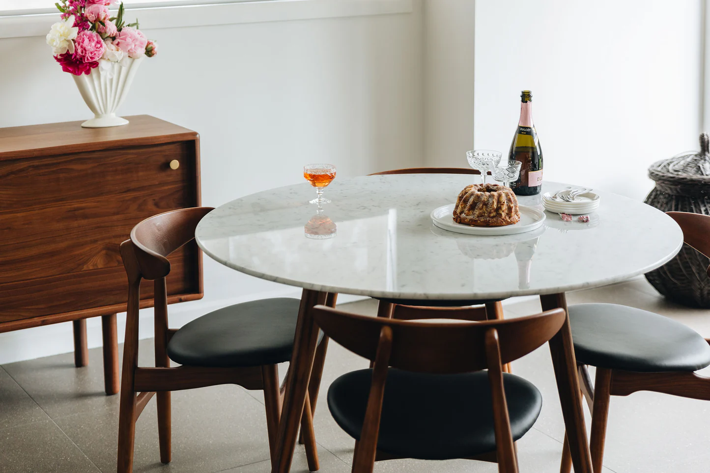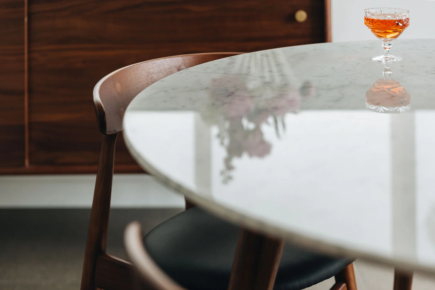 The Radius has been crafted from Italian Carrara marble, renowned for its white and blue-grey appearance. Found in mountainous regions, marble is a calcium carbonate-based stone formed by extreme heat and pressure, resulting in a crystalline material. Every piece has veins of mineral patterns that make up its unique appearance. Easy to polish and excellent heat resistance, marble is a durable surface; however, it is porous, and care must be taken, especially with acidic spills. Marble will develop its patina over time, depending on the level of care you give it.