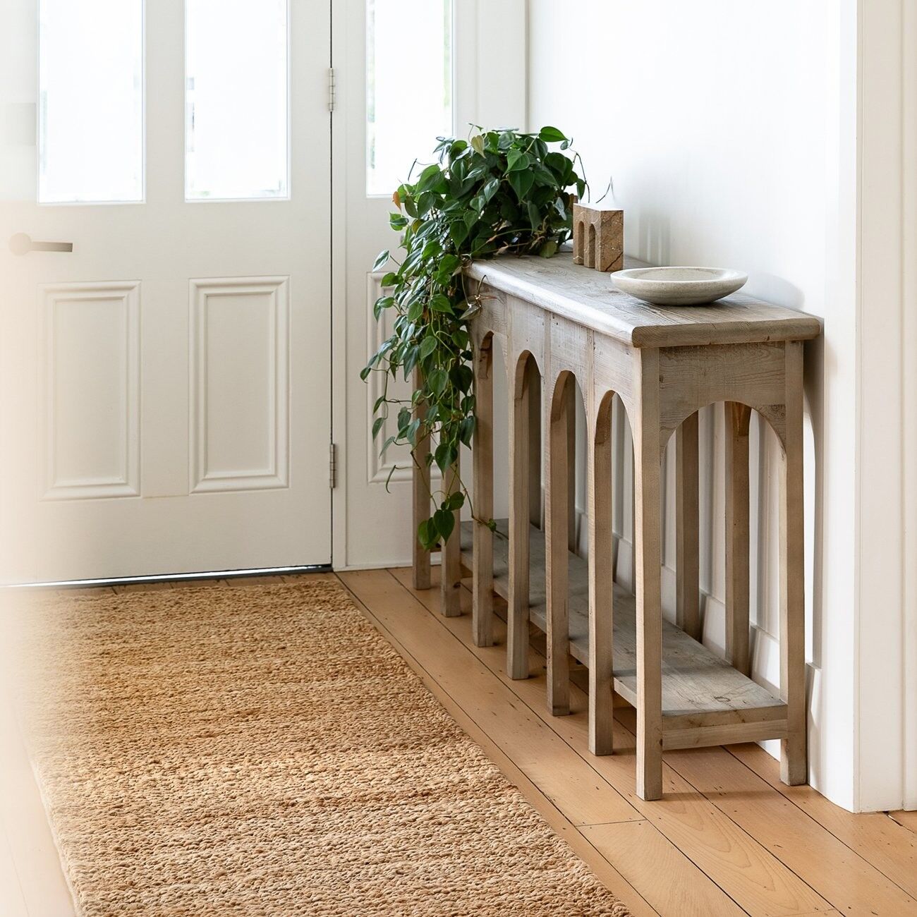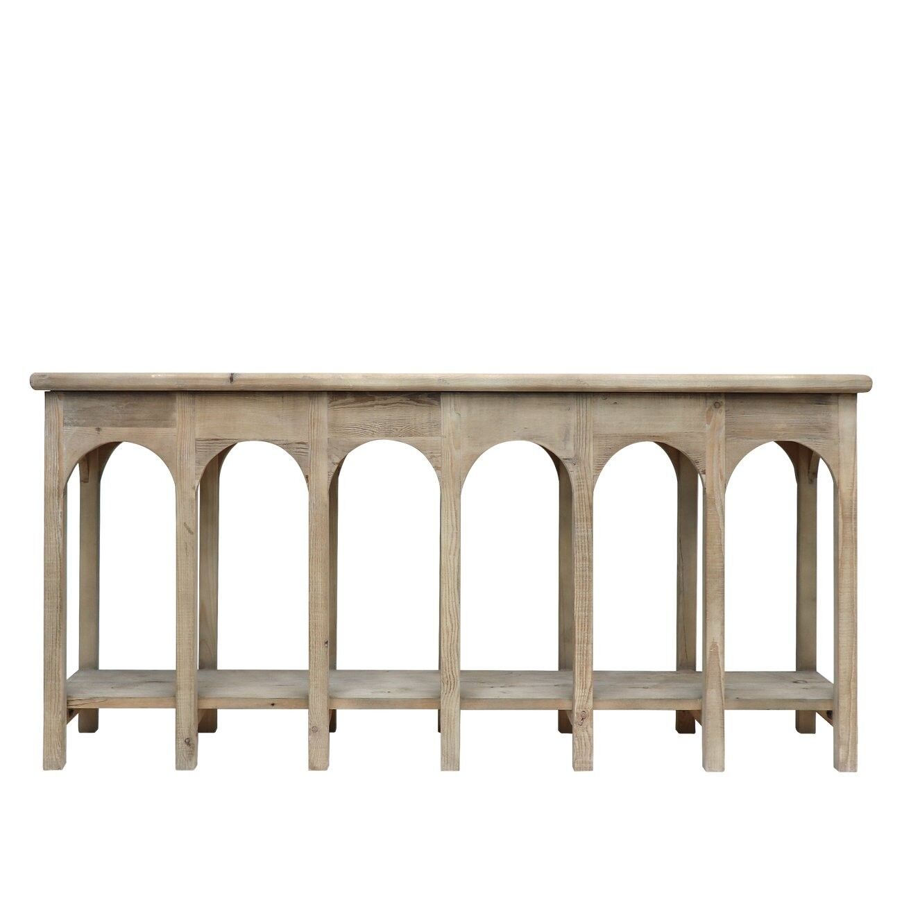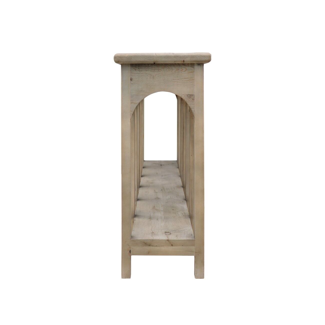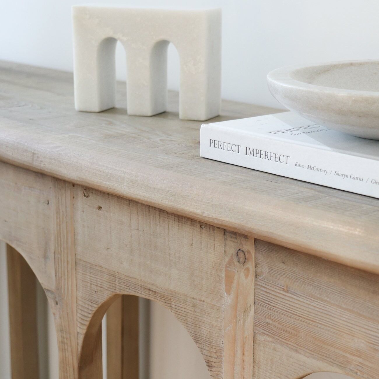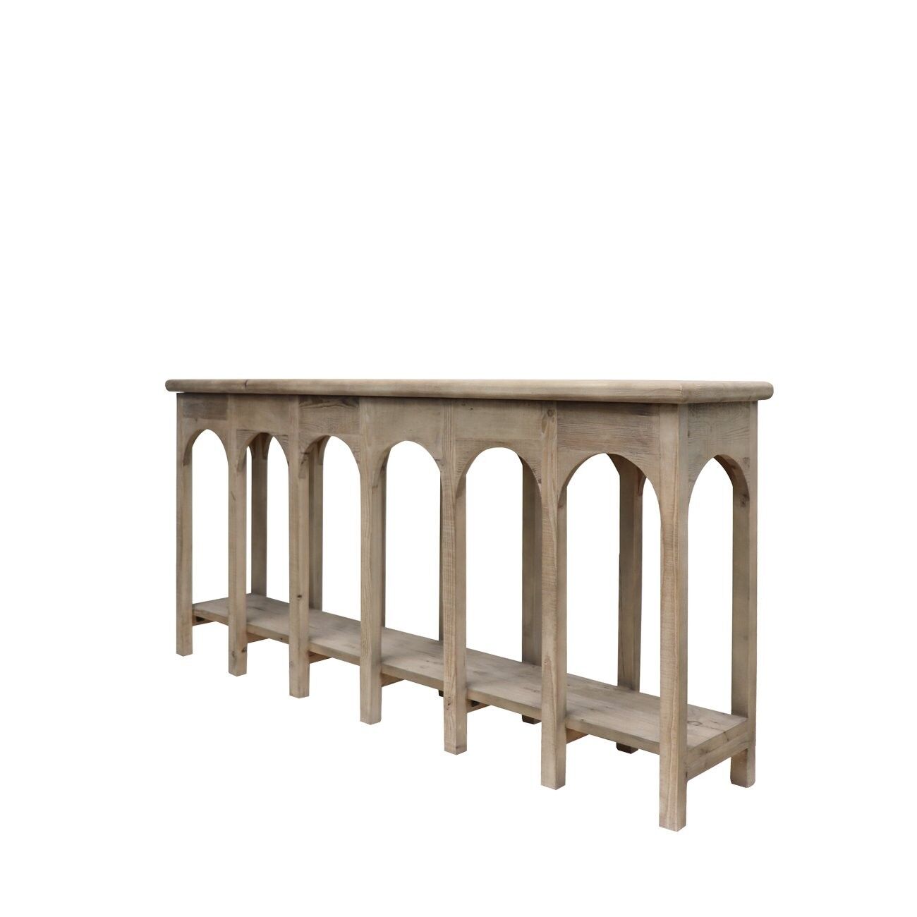 Welcome the arch to your home with our Sandberg console table. Six gentle arches sit beneath a solid top with the added feature of a lower shelf providing multiple display options. Produced in recycled pine with a light grey wash finish.