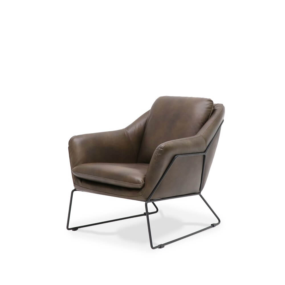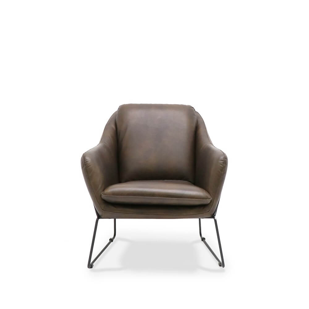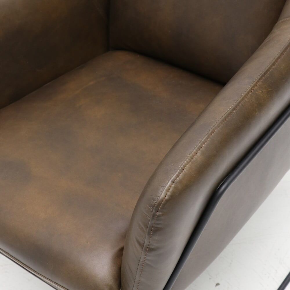 The perfectly formed bucket seat encloses two soft cushions, and is fully upholstered in full-grain antique Brown leather.